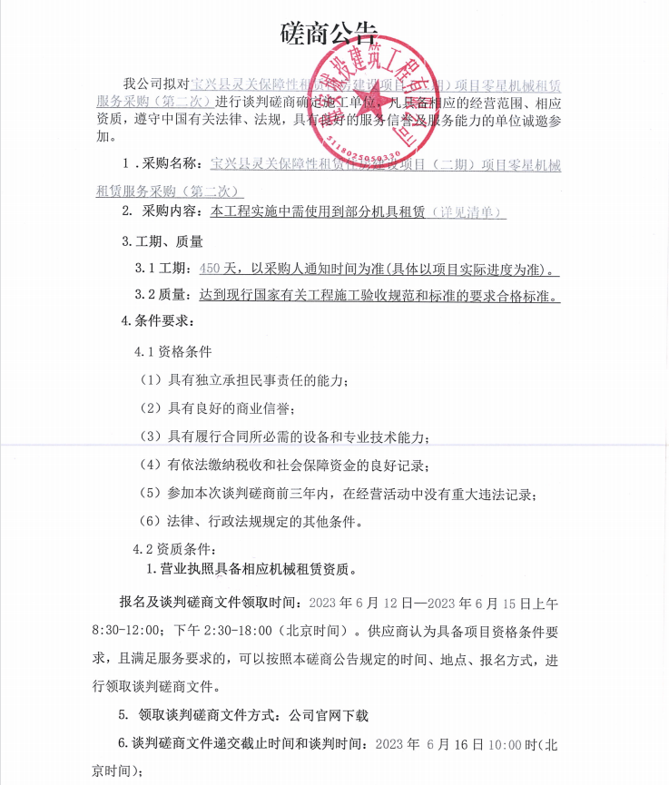 寶興縣靈關(guān)保障性租賃住房建設(shè)項目(二期)項目零星機械租賃服務(wù)采購(第二次)談判磋商公告