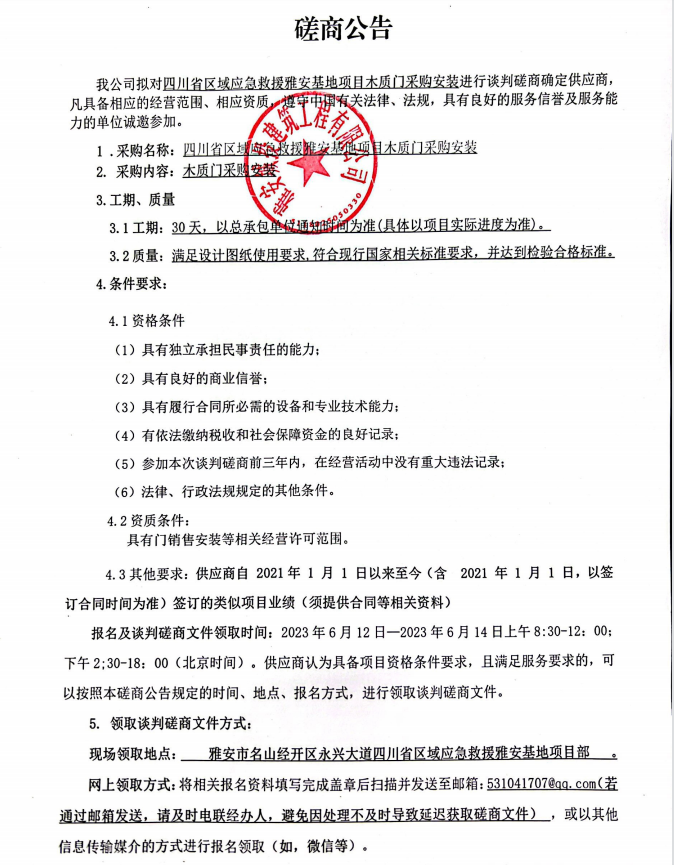 四川省區(qū)域應(yīng)急救援雅安基地項(xiàng)目木質(zhì)門(mén)采購(gòu)安裝談判磋商公告