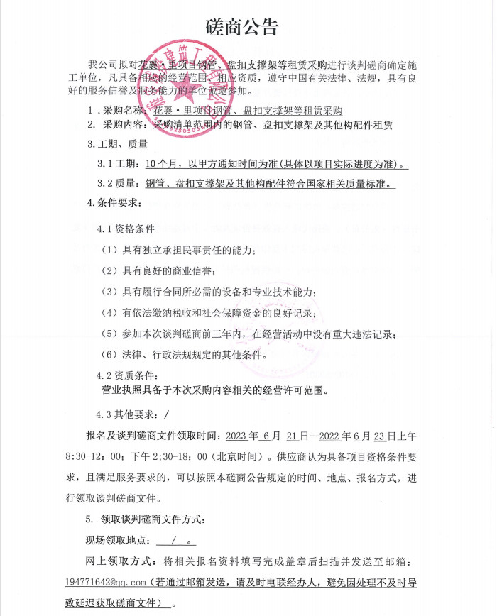 花襄·里項(xiàng)目鋼管、盤扣支撐架等租賃采購談判磋商公告