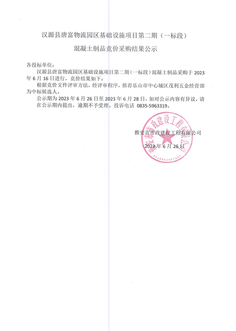 漢源縣唐富物流園區(qū)基礎(chǔ)設(shè)施項(xiàng)目第二期 (一標(biāo)段)混凝土制品采購競價(jià)結(jié)果公示