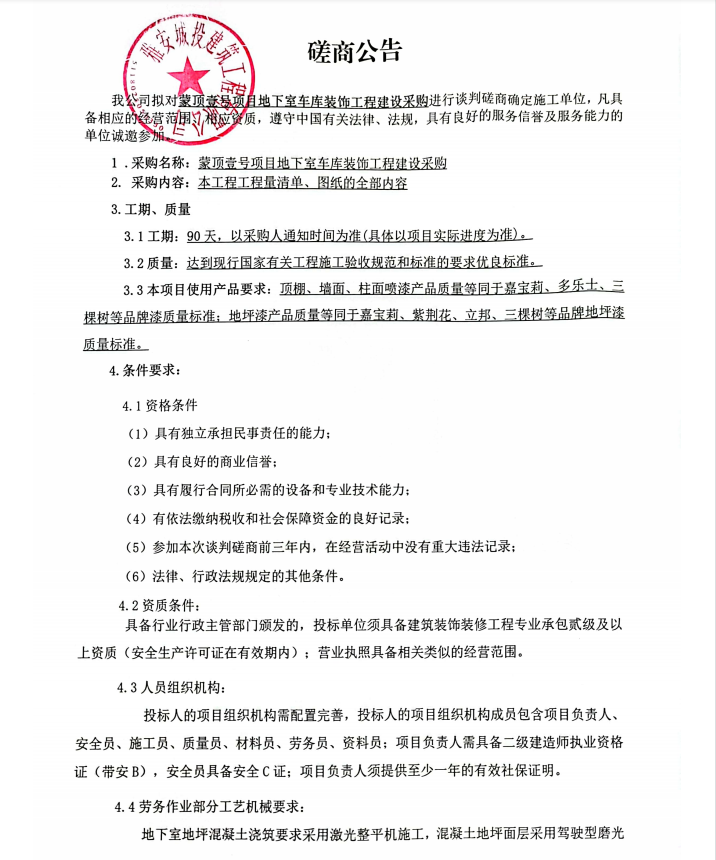蒙頂壹號(hào)項(xiàng)目地下室車庫裝飾工程建設(shè)采購談判磋商公告