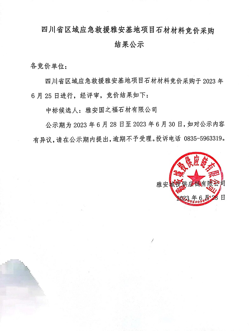 四川省區(qū)域應急救援雅安基地項目石材材料競價采購結(jié)果公示