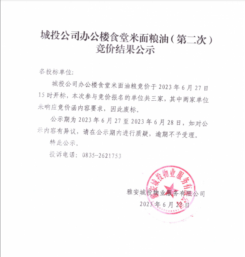 城投公司辦公樓食堂米面糧油(第二次)競價結果公示