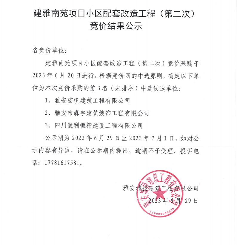 建雅南苑項目小區(qū)配套改造工程(第二次)競價結(jié)果公示