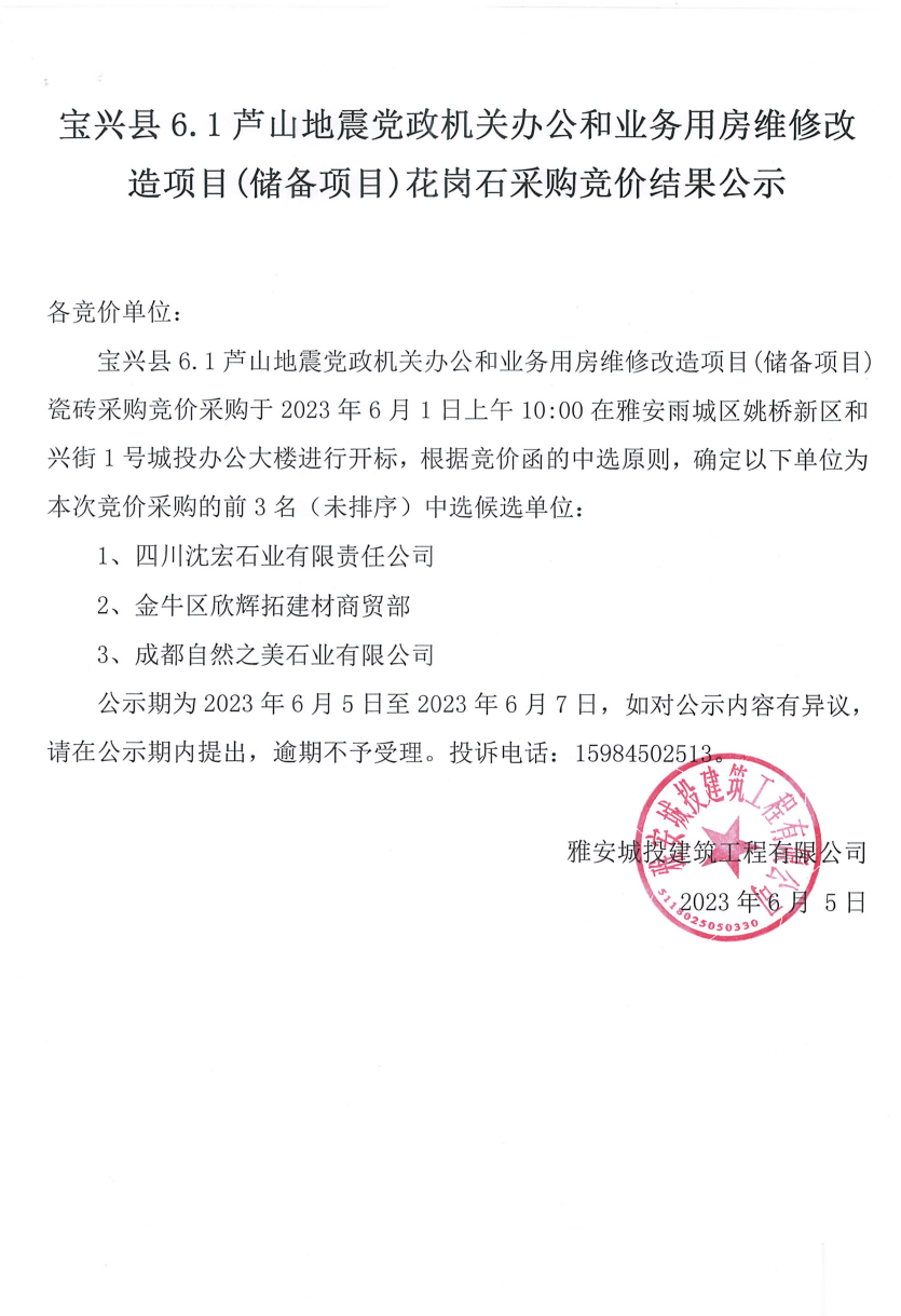 寶興縣6.1蘆山地震黨政機(jī)關(guān)辦公和業(yè)務(wù)用房維修改造項(xiàng)目(儲備項(xiàng)目)花崗石采購競價(jià)結(jié)果公示