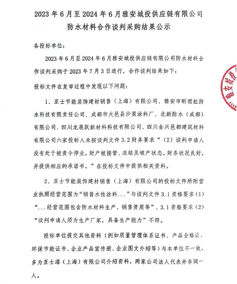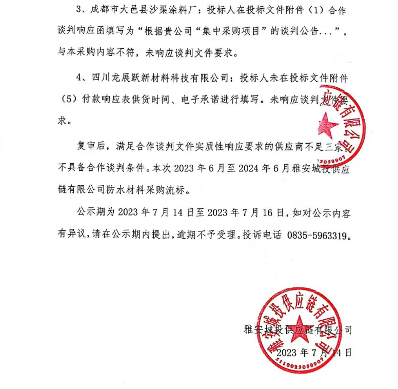 2023年6月至2024年6月雅安城投供應(yīng)鏈有限公司防水材料合作談判采購(gòu)結(jié)果公示