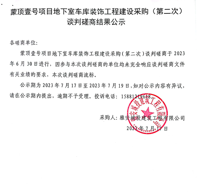 蒙頂壹號項(xiàng)目地下室車庫裝飾工程建設(shè)采購(第二次)談判磋商結(jié)果公示