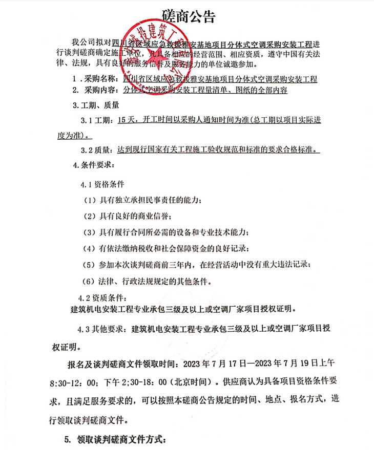 四川省區(qū)域應(yīng)急救援雅安基地項目分體式空調(diào)采購安裝工程談判磋商公告