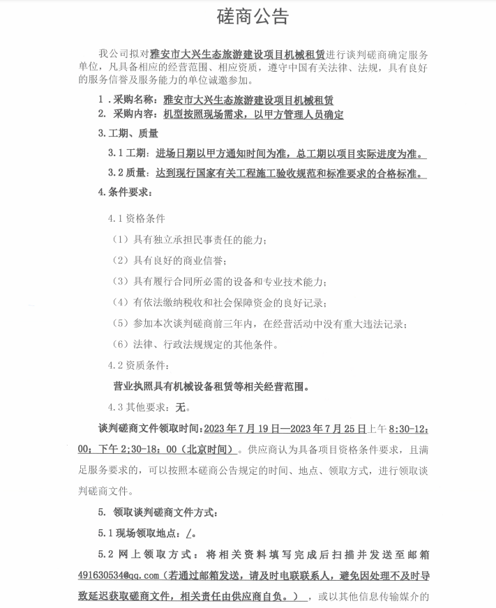 雅安市大興生態(tài)旅游建設項目機械租賃談判磋商公告