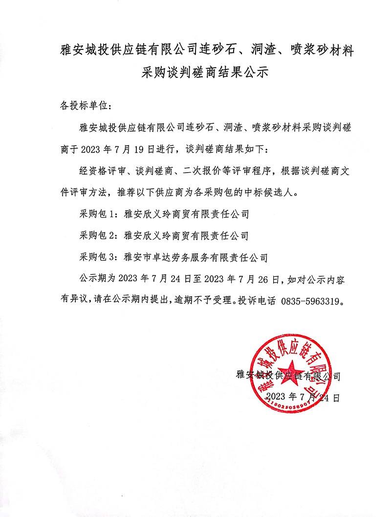 雅安城投供應(yīng)鏈有限公司連砂石、洞渣、噴漿砂材料采購談判磋商結(jié)果公示