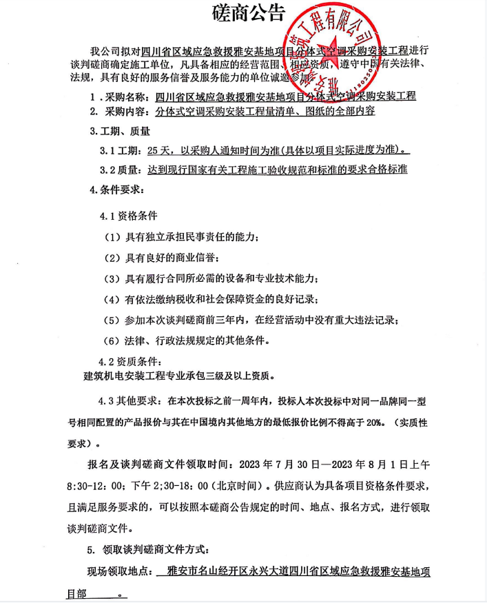 四川省區(qū)域應(yīng)急救援雅安基地項(xiàng)目分體式空調(diào)采購(gòu)安裝工程談判磋商公告