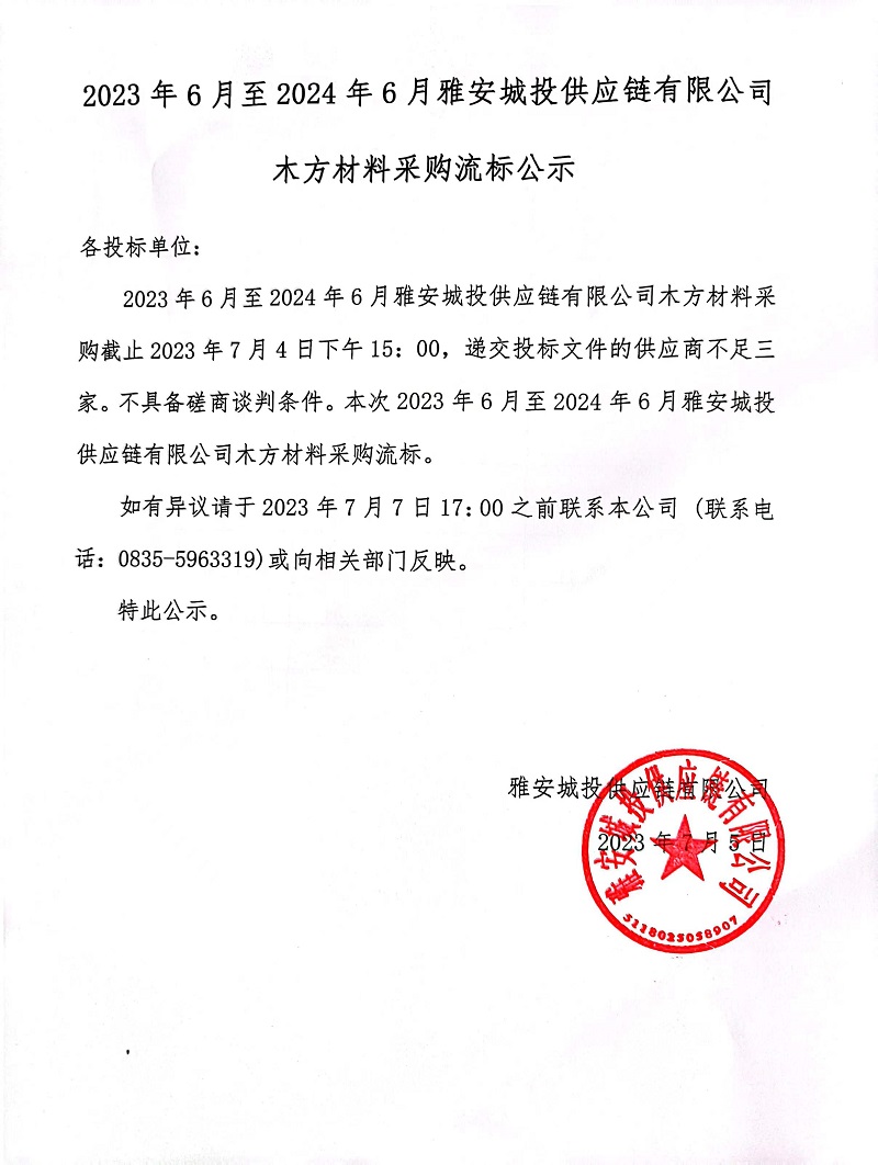 2023年6月至2024年6月雅安城投供應鏈有限公司木方材料采購流標公示