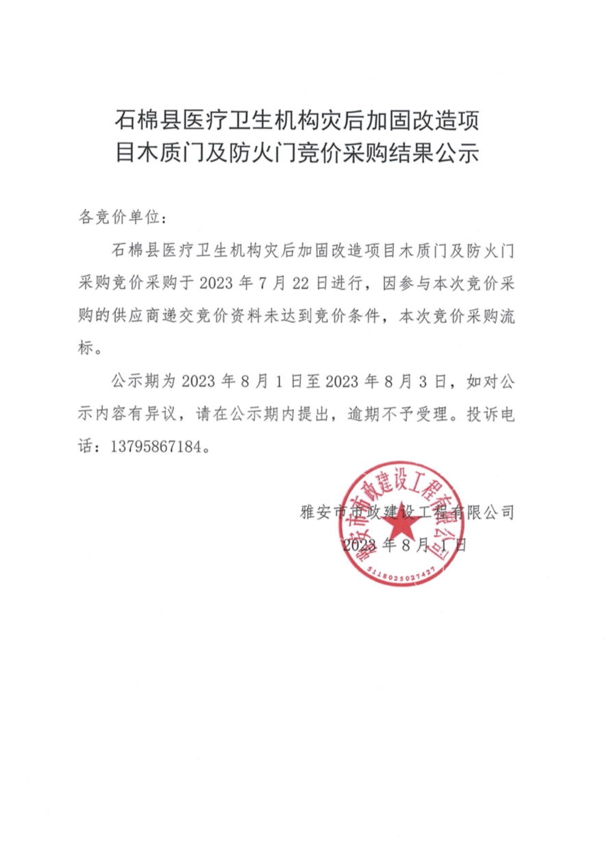 石棉縣醫(yī)療衛(wèi)生機(jī)構(gòu)災(zāi)后加固改造項(xiàng)目木質(zhì)門及防火門競價(jià)采購結(jié)果公示