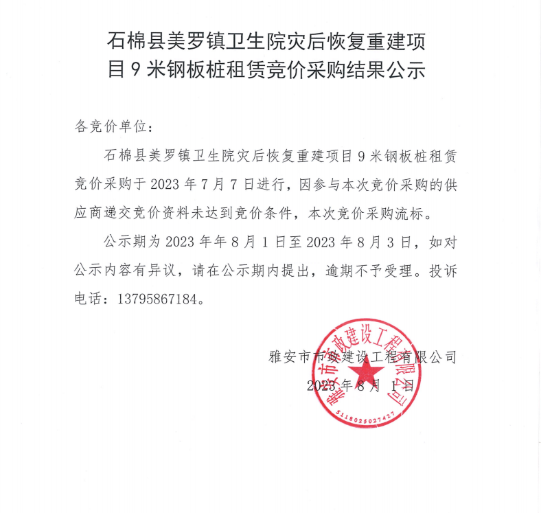 石棉縣美羅鎮(zhèn)衛(wèi)生院災后恢復重建項目9米鋼板樁租賃競價采購結果公示