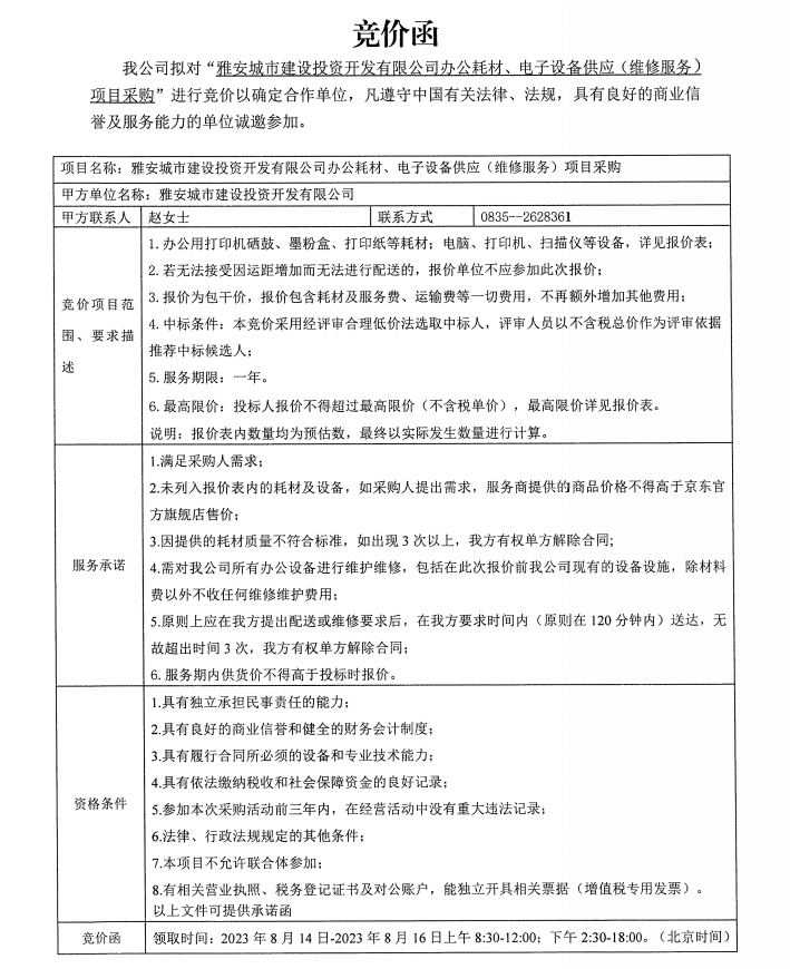 雅安城市建設(shè)投資開發(fā)有限公司辦公耗材、電子設(shè)備供應(yīng)(維修服務(wù))項(xiàng)目采購競價公告