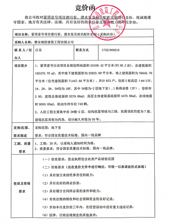 蒙頂壹號(hào)項(xiàng)目潛污泵、潛水泵及相關(guān)配件采購競(jìng)價(jià)公告