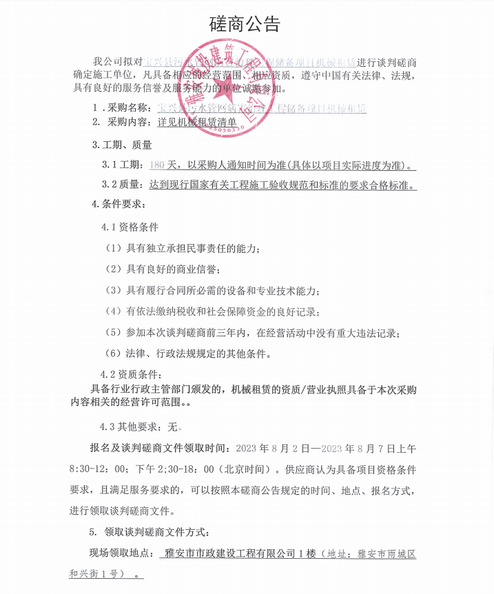 寶興縣污水管網(wǎng)病害治理工程儲備項目機(jī)械租賃談判磋商公告