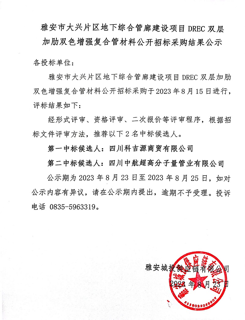 雅安市大興片區(qū)地下綜合管廊建設項目DREC雙層加肋雙色增強復合管材料公開招標采購結果公示