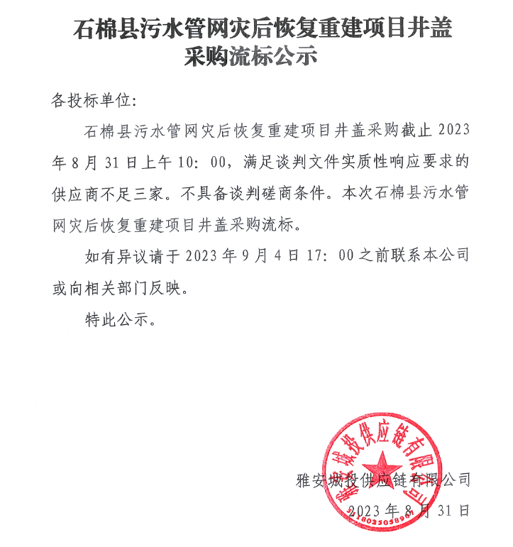 石棉縣污水管網(wǎng)災后恢復重建項目井蓋采購流標公示