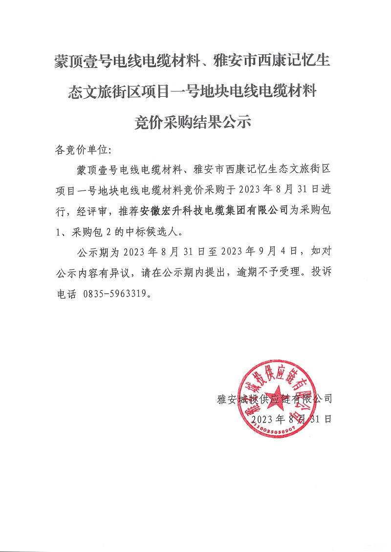 蒙頂壹號電線電纜材料、雅安市西康記憶生態(tài)文旅街區(qū)項(xiàng)目一號地塊電線電纜材料競價(jià)采購結(jié)果公示