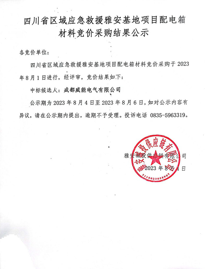 四川省區(qū)域應(yīng)急救援雅安基地項目配電箱材料競價采購結(jié)果公示