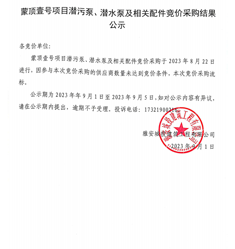 蒙頂壹號項目潛污泵、潛水泵及相關(guān)配件競價采購結(jié)果公示