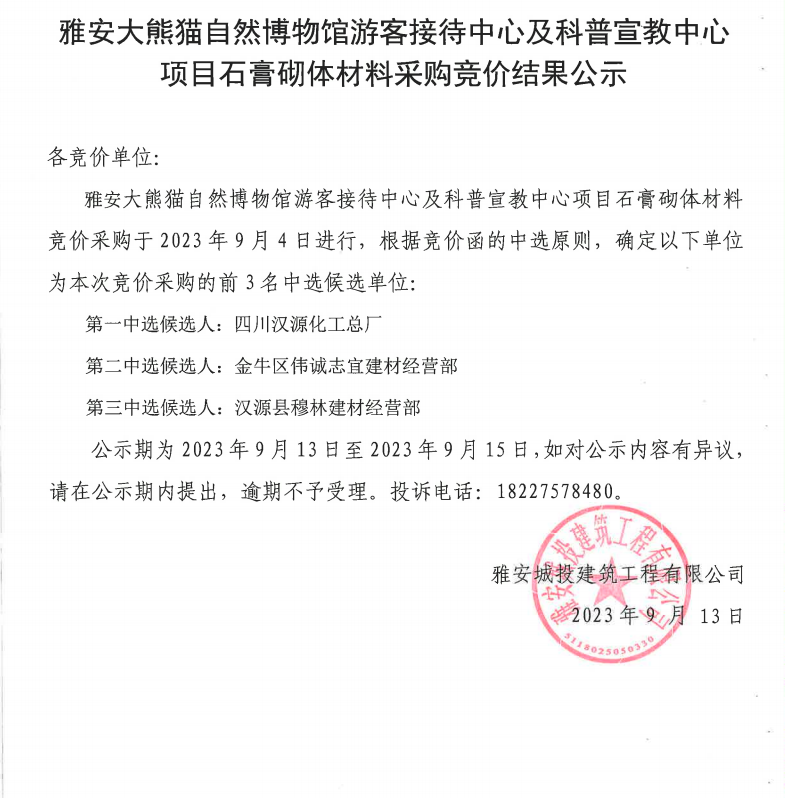 雅安大熊貓自然博物館游客接待中心及科普宣教中心項(xiàng)目石膏砌體材料采購競(jìng)價(jià)結(jié)果公示