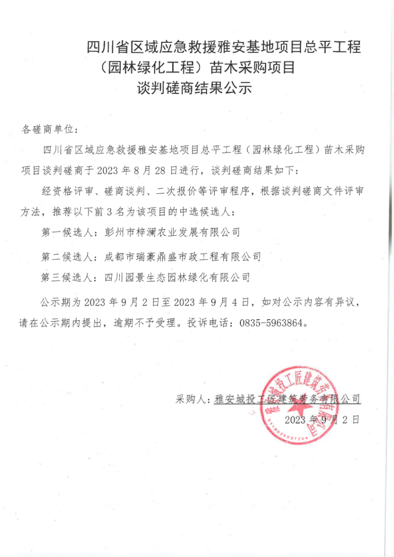 四川省區(qū)域應急救援雅安基地項目總平工程(園林綠化工程)苗木采購項目談判磋商結果公示