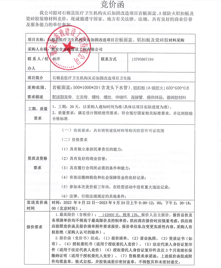 石棉縣醫(yī)療衛(wèi)生機(jī)構(gòu)災(zāi)后加固改造項(xiàng)目巖板面盆、A級防火鋁扣板及瓷磚膠材料采購競價公告