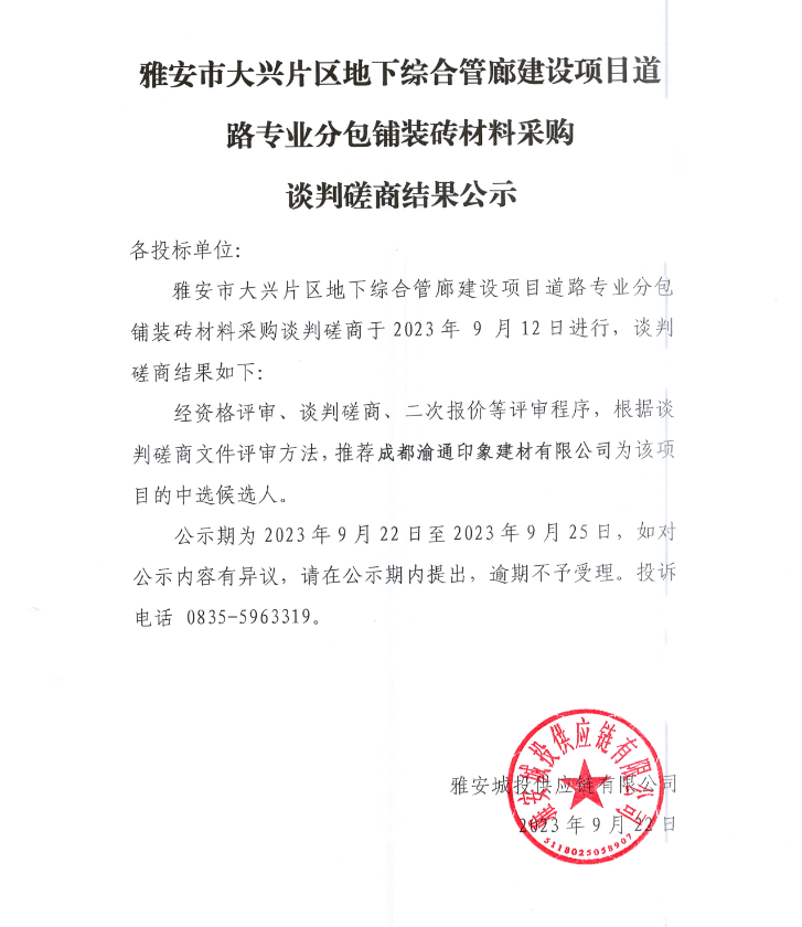 雅安市大興片區(qū)地下綜合管廊建設項目道路專業(yè)分包鋪裝磚材料采購談判磋商結果公示