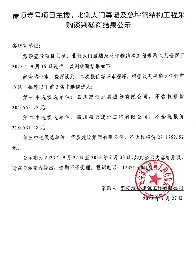 蒙頂壹號(hào)項(xiàng)目主樓、北側(cè)大門(mén)幕墻及總坪鋼結(jié)構(gòu)工程采購(gòu)談判磋商結(jié)果公示
