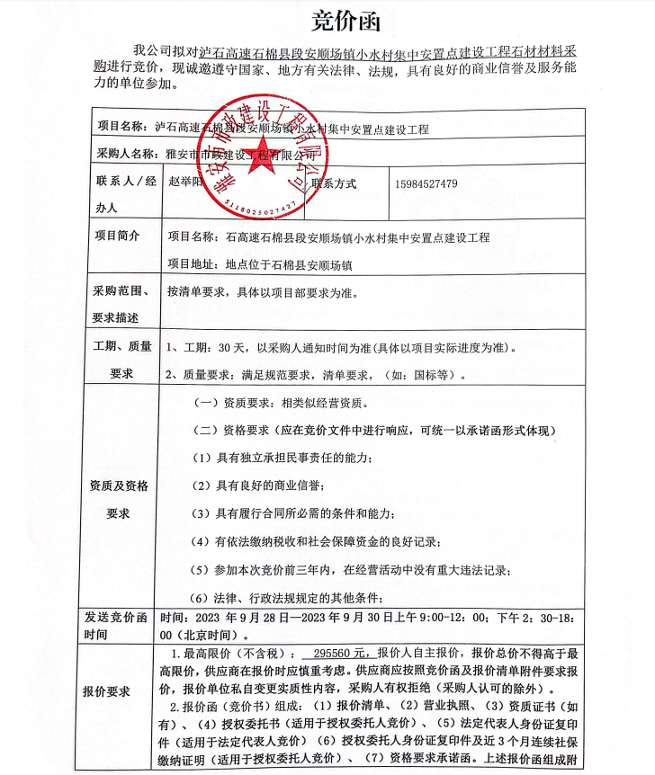 瀘石高速石棉縣段安順場(chǎng)小水村集中安置點(diǎn)建設(shè)工程石材材料采購(gòu)競(jìng)價(jià)公告