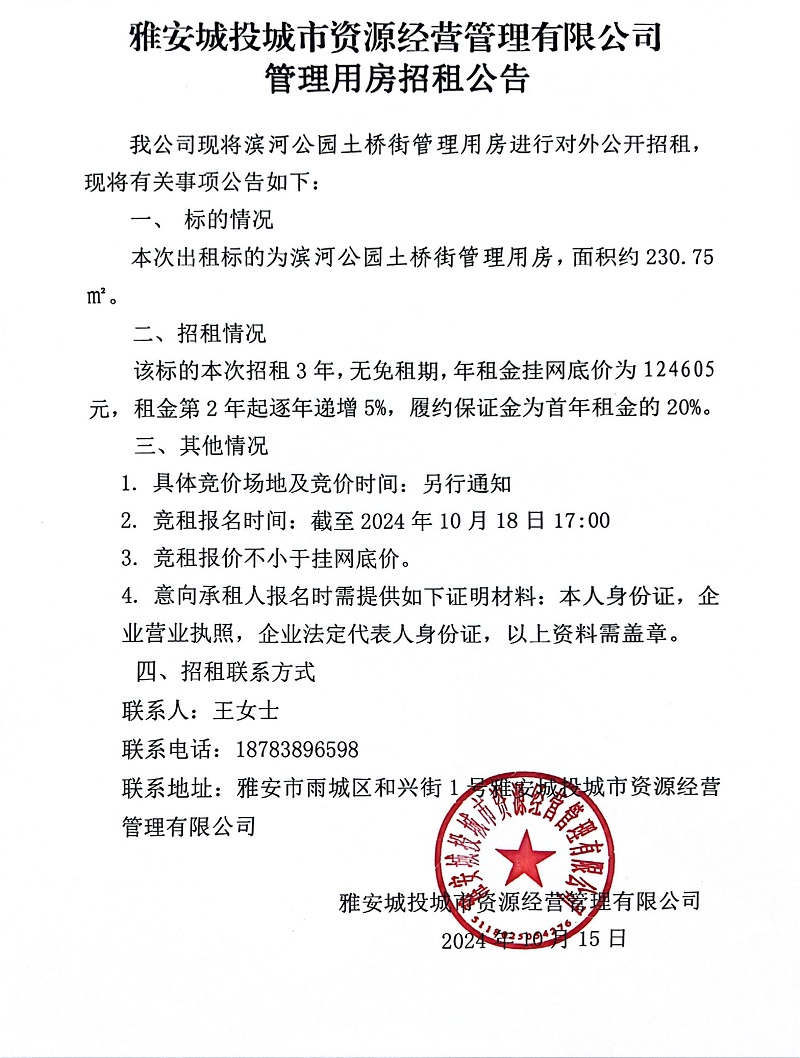 雅安城投城市資源經營管理有限公司關于濱江公園土橋街管理用房招租的公告