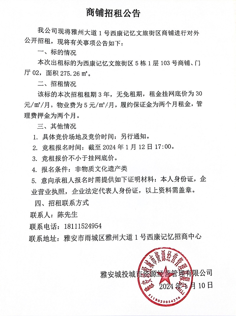 雅州大道1號西康記憶文旅街區(qū)5棟1層103號商鋪、門廳02招租公告
