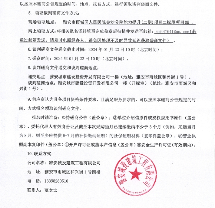 雅安市雨城區(qū)人民醫(yī)院金沙分院能力提升(二期)項目二標(biāo)段人造石材料(第二次)采購談判磋商公告