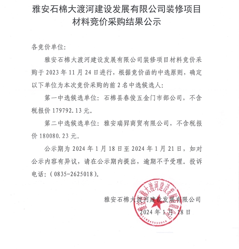 雅安石棉大渡河建設(shè)發(fā)展有限公司裝修材料競(jìng)價(jià)采購結(jié)果公示