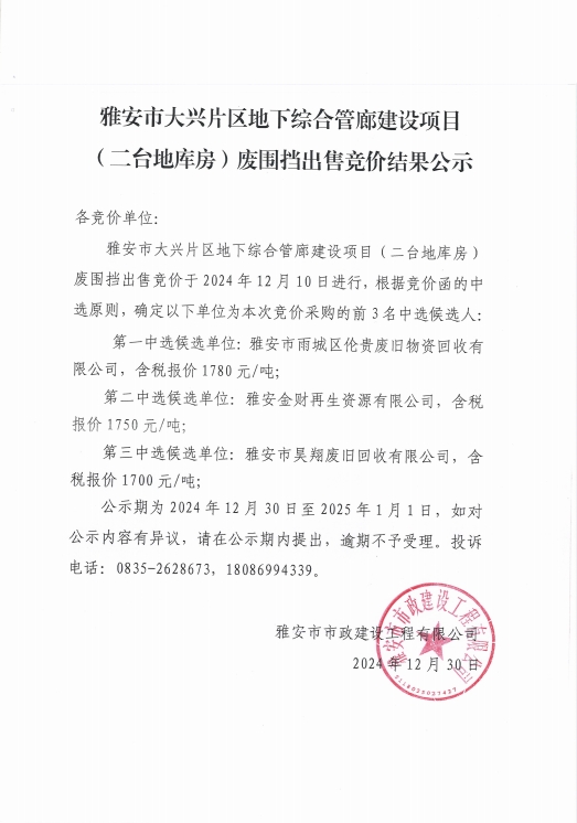 雅安市大興片區(qū)地下綜合管廊建設(shè)項(xiàng)目 (二臺(tái)地庫(kù)房)廢圍擋出售竟價(jià)結(jié)果公示