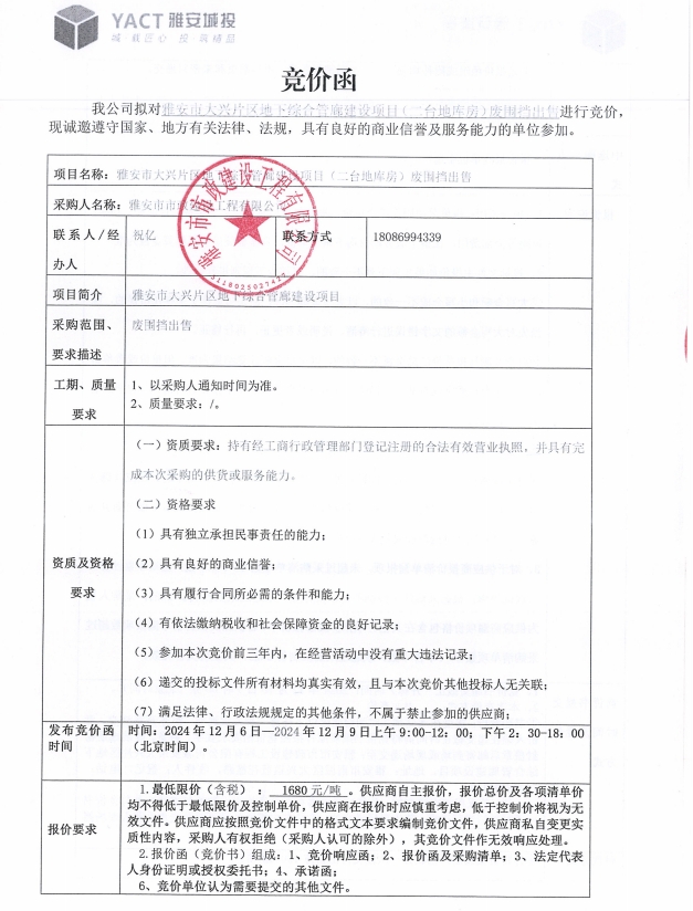雅安市大興片區(qū)地下綜合管廊建設(shè)項目(二臺地庫房)廢圍擋出售競價公告