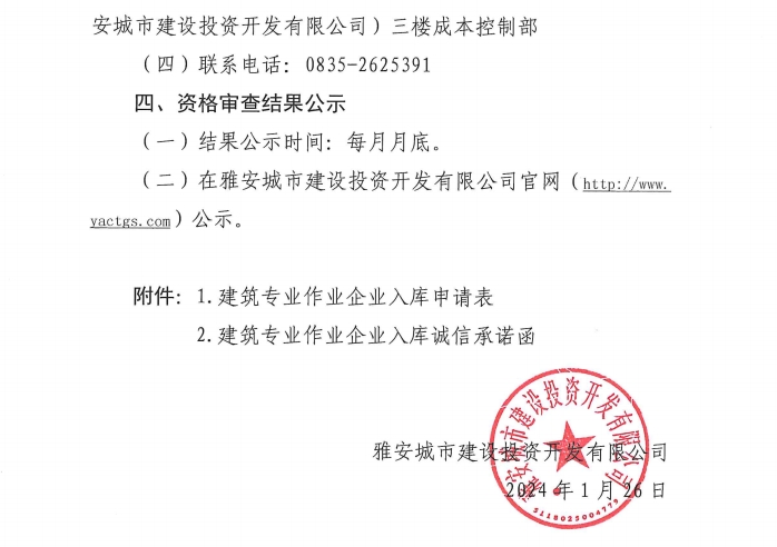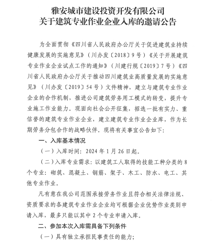 雅安城市建設投資開發(fā)有限公司關于建筑專業(yè)作業(yè)企業(yè)入庫的邀請公告