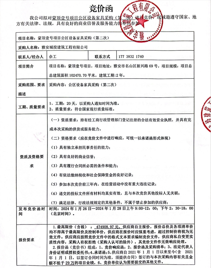 蒙頂壹號(hào)項(xiàng)目公區(qū)設(shè)備家具采購(gòu)(第二次)競(jìng)價(jià)公告