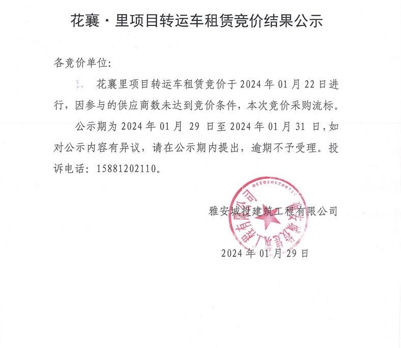 花襄·里項(xiàng)目轉(zhuǎn)運(yùn)車租賃競價(jià)結(jié)果公示