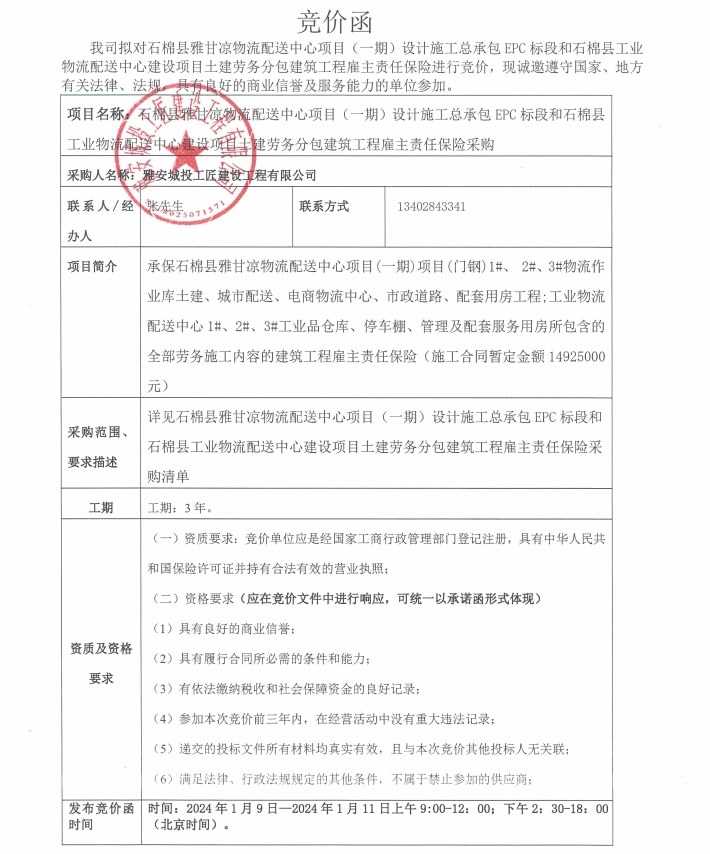 石棉縣雅甘涼物流配送中心項(xiàng)目(一期)設(shè)計(jì)施工總承包EPC標(biāo)段和石棉縣工業(yè)物流配送中心建設(shè)項(xiàng)目土建勞務(wù)分包建筑工程雇主責(zé)任保險(xiǎn)采購(gòu)競(jìng)價(jià)公告