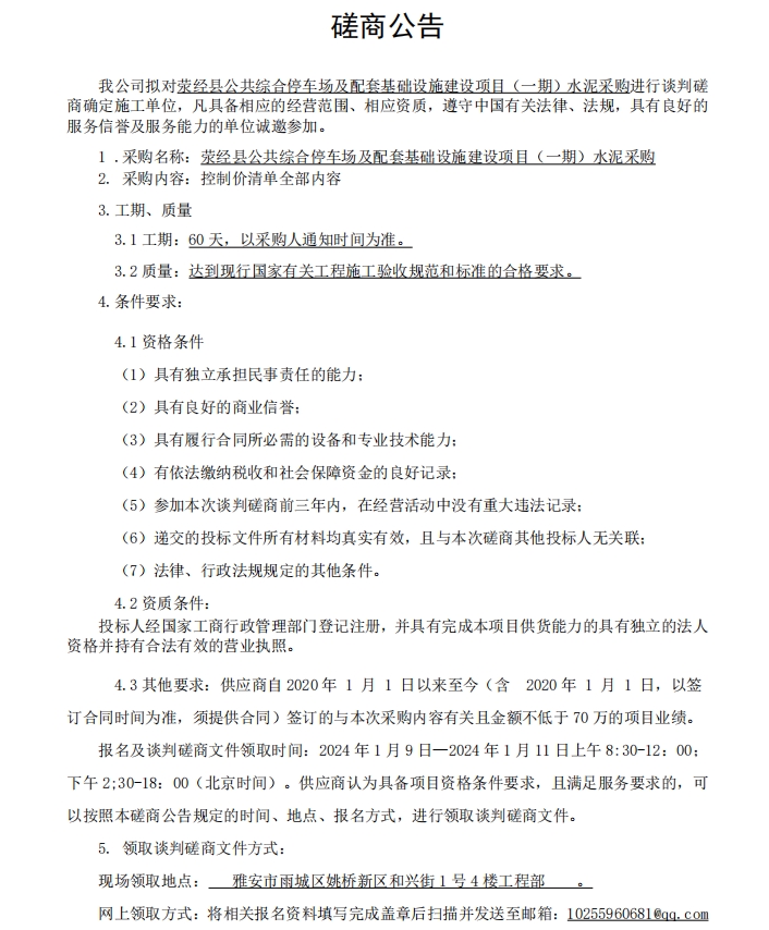 滎經(jīng)縣公共綜合停車場(chǎng)及配套基礎(chǔ)設(shè)施建設(shè)項(xiàng)目(一期)水泥材料采購談判磋商公告