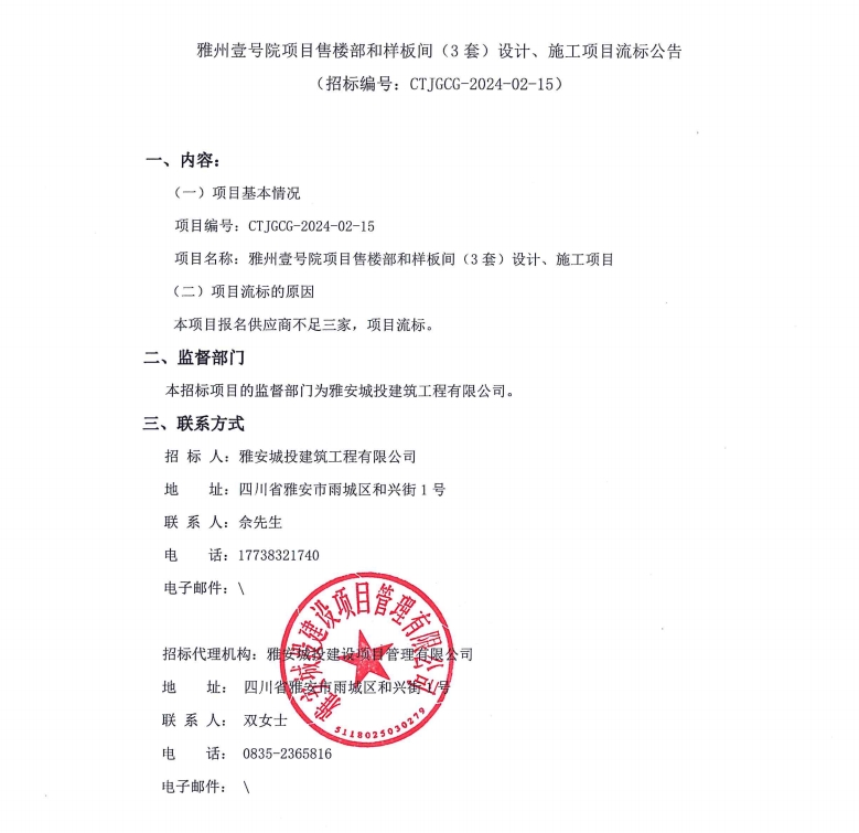 雅州壹號(hào)院項(xiàng)目售樓部和樣板間(3套)設(shè)計(jì)、施工項(xiàng)目流標(biāo)公告
