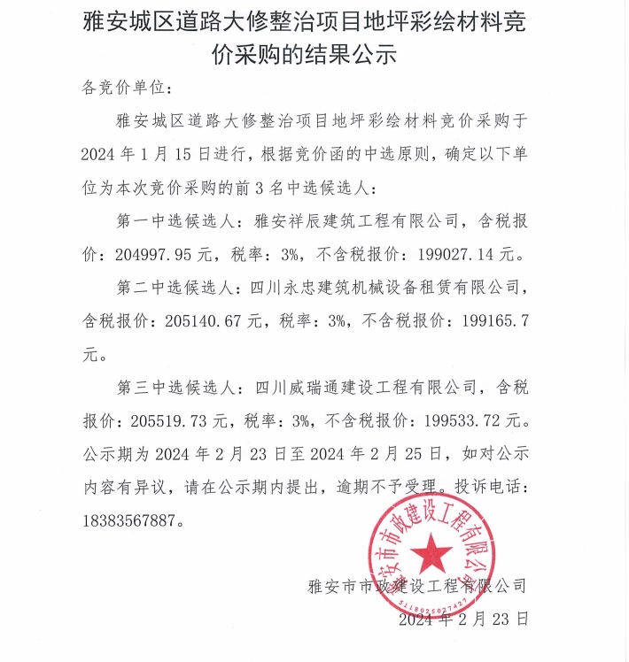 雅安城區(qū)道路大修整治項(xiàng)目地坪彩繪材料競(jìng)價(jià)采購(gòu)的結(jié)果公示