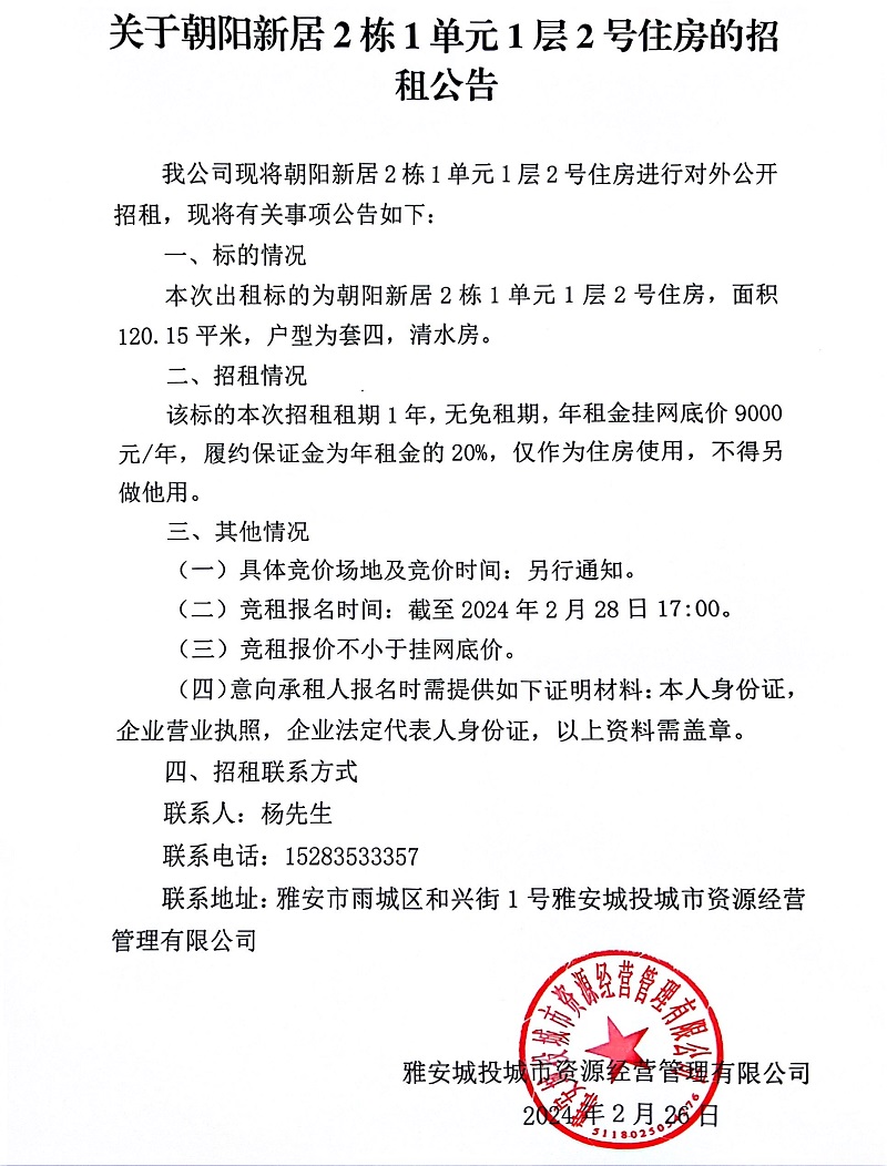關(guān)于朝陽新居2棟1單元1層2號住房的招租公告