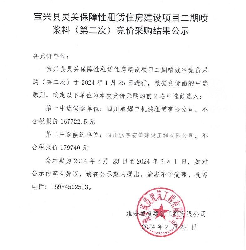 寶興縣靈關保障性租賃住房建設項目二期噴漿料(第二次)競價采購結(jié)果公示