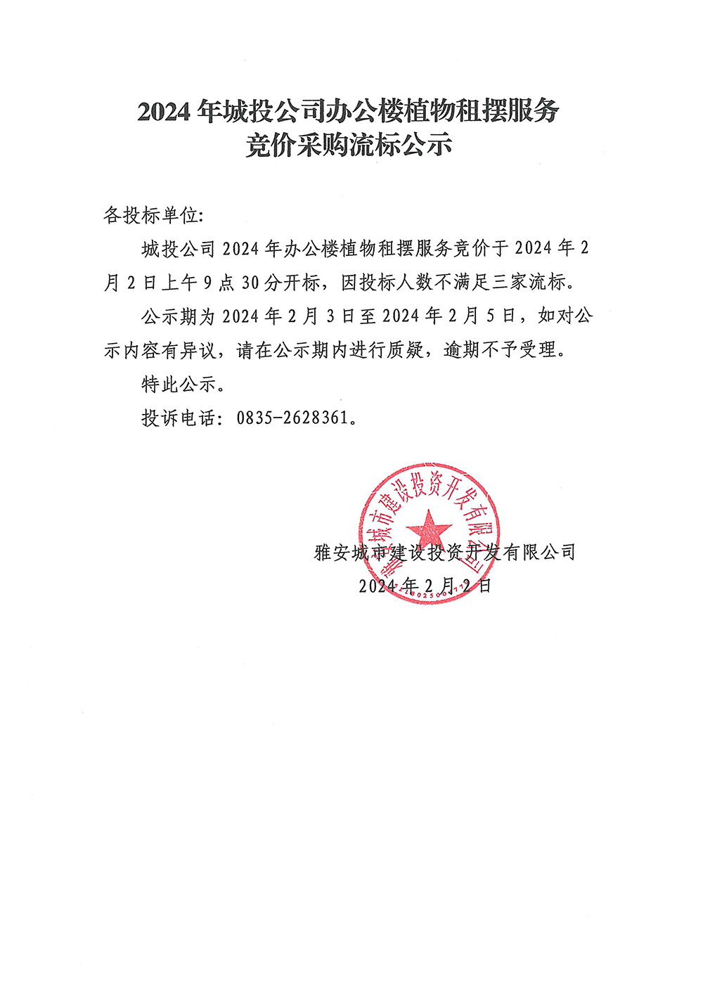 2024年城投公司辦公樓植物租擺服務(wù)競價采購流標(biāo)公示