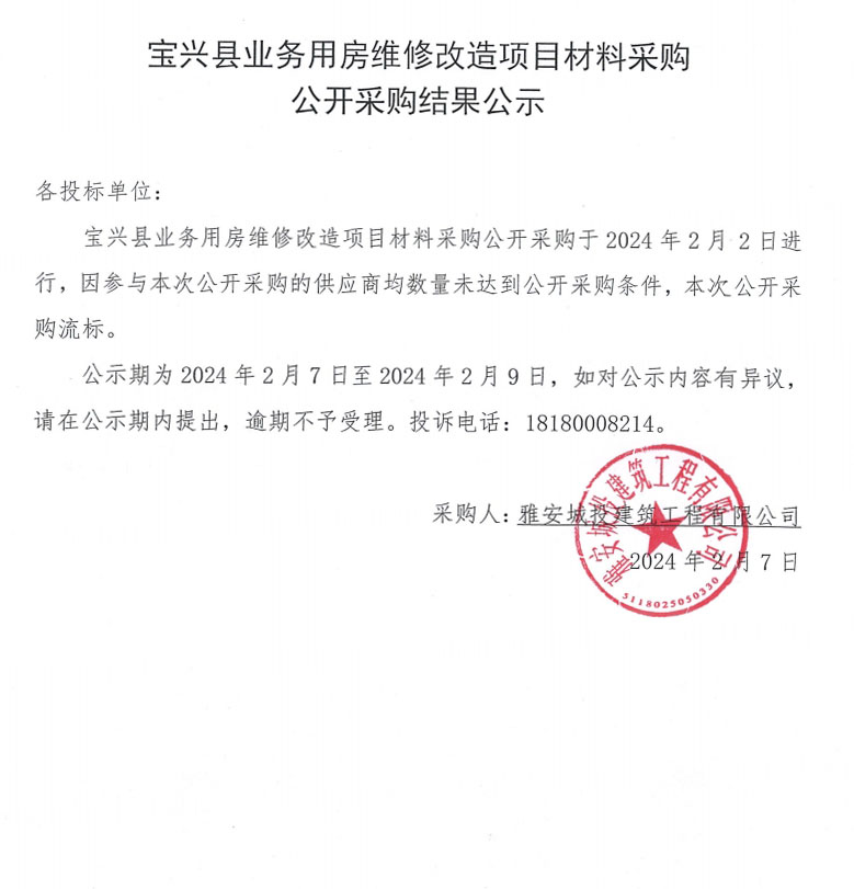 寶興縣業(yè)務(wù)用房維修改造項(xiàng)目材料采購公開采購結(jié)果公示