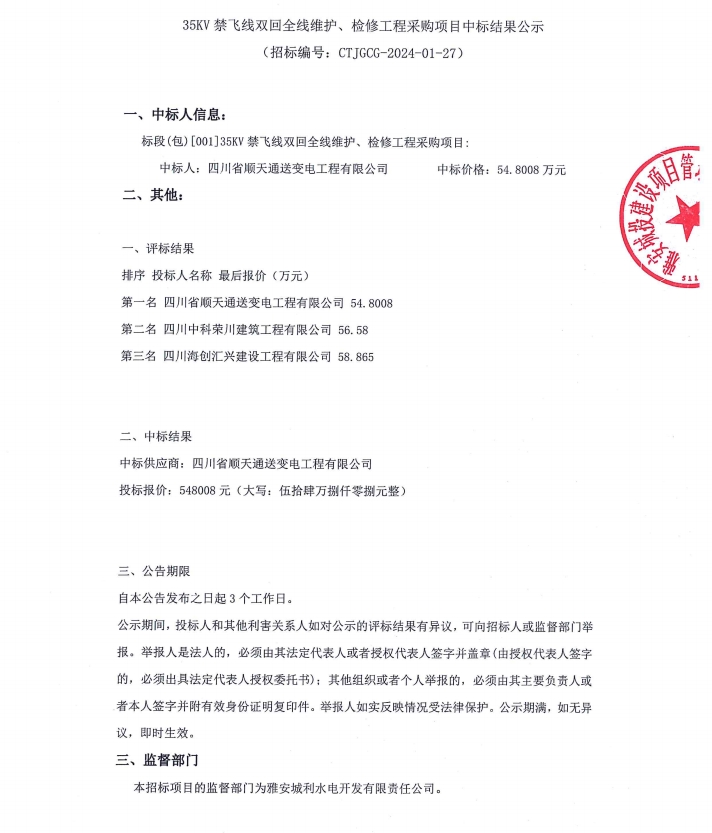 35KV禁飛線雙回全線維護、檢修工程采購項目中標(biāo)結(jié)果公示
